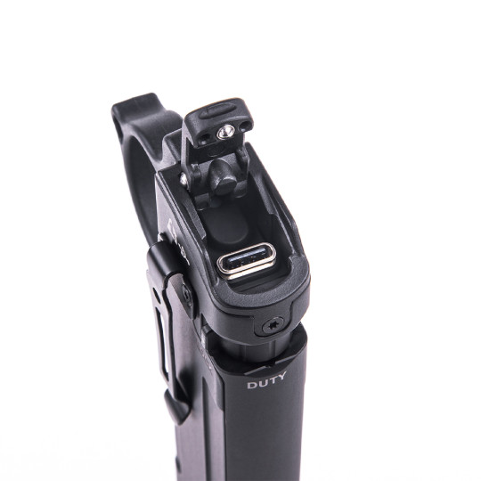 Die Lampe verfügt über einen seitlichen, rotierenden Moduswahlschalter mit den Positionen Tactical, Duty und Lock sowie über einen zusätzlichen Schalter auf der Oberseite. Diese Kombination ermöglicht einen schnellen, kontrollierten Zugriff auf die verschiedenen Leuchtmodi und verhindert unbeabsichtigtes Einschalten beim Transport.