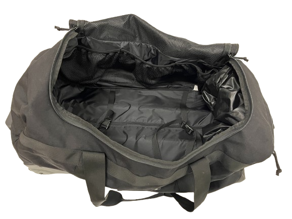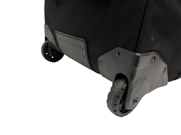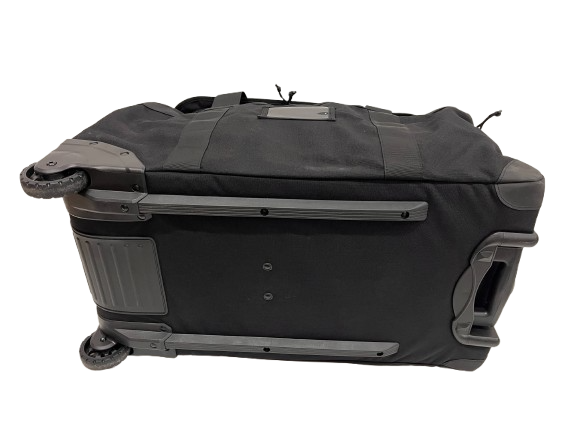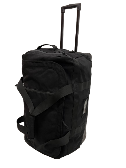 Reisetrolley mit Rollen aus Armeebeständen. Der Trolley hat ein großes Hauptfach mit innenliegenden Kompressionsgurten und zwei Wasserdichte Außen taschen.