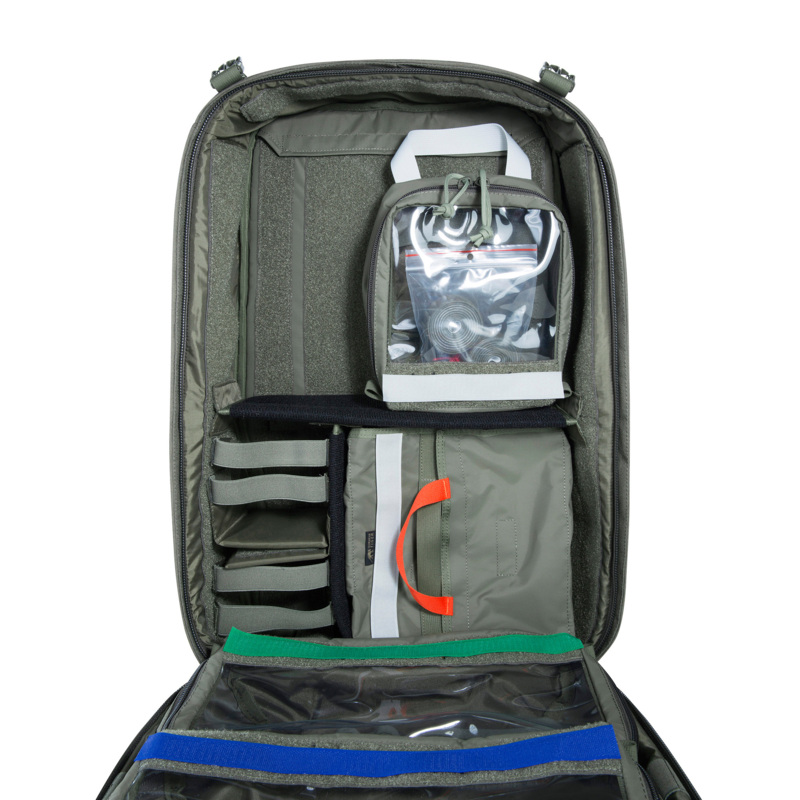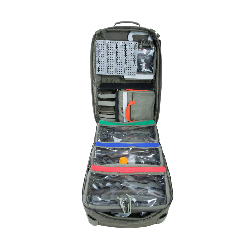 Durch variabel einklettbare Trennwände, herausnehmbare Taschen sowie ein ausklettbares Tegris®-Panel (SRPP) kann die Innenaufteilung individuell angepasst werden. Diverse Elastikschlaufen, Klarsichttaschen und Befestigungsmöglichkeiten ermöglichen eine übersichtliche Organisation medizinischer Materialien.