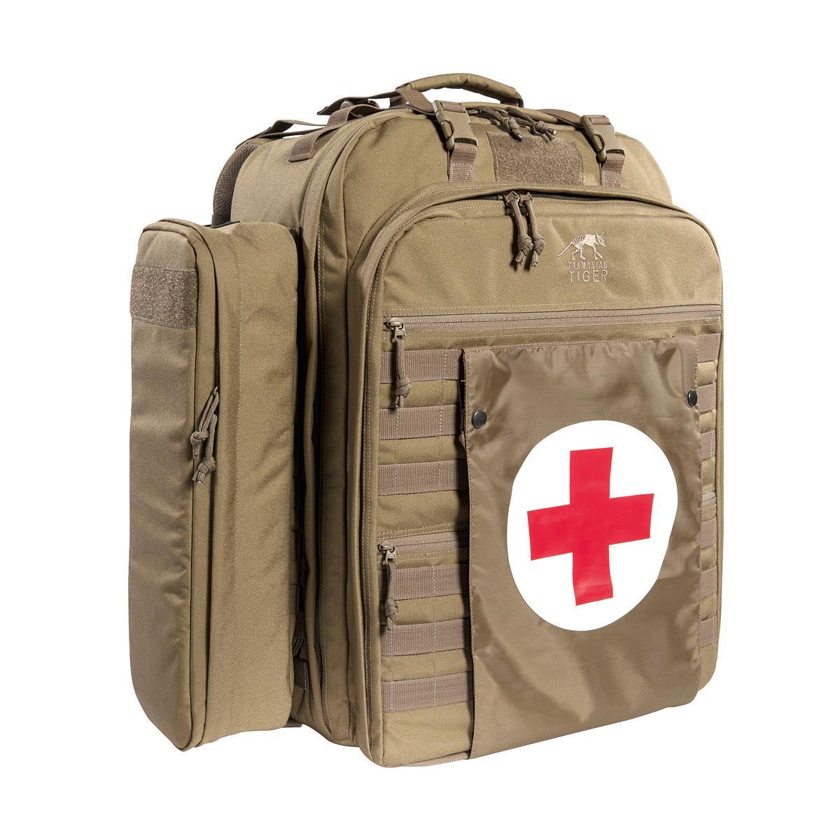Großer, umfangreich ausgestatteter Erste-Hilfe-Rucksack. Die Seitentaschen lassen sich abnehmen, das gepolsterte Innenfach ist mit verstellbaren Facheinteilungen versehen. Der Rucksack besitzt zudem ein herausnehmbares Panel mit abnehmbaren, beschriftbaren Klarsichttaschen, MOLLE-System und elastischen Schlaufen.