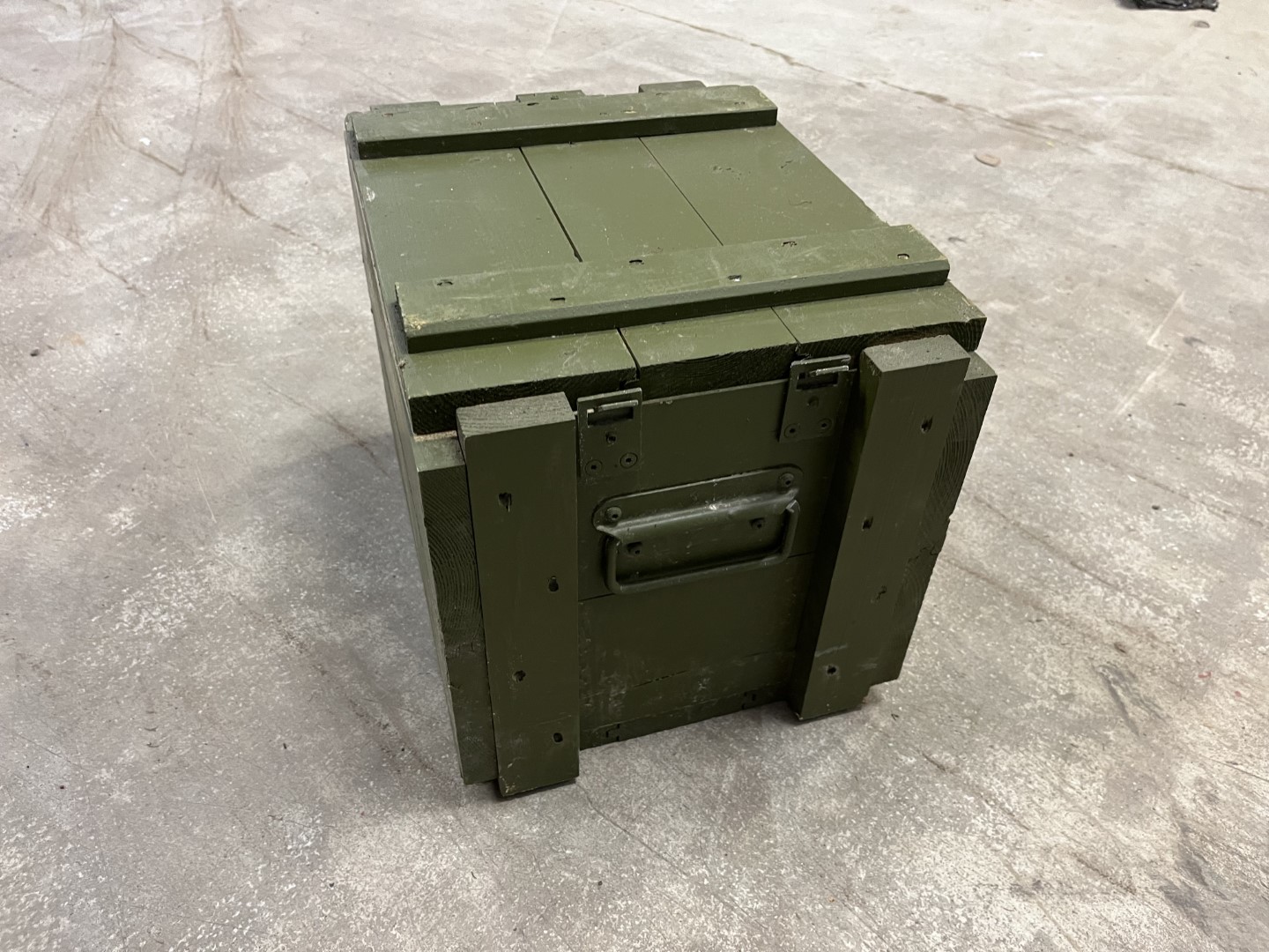 Original Militär-Holzkiste aus Armeebestand mit stabilem Deckel und Metallverschluss. Die robuste Kiste besteht aus massivem Holz und ist außen in olivgrüner Militärfarbe lackiert.