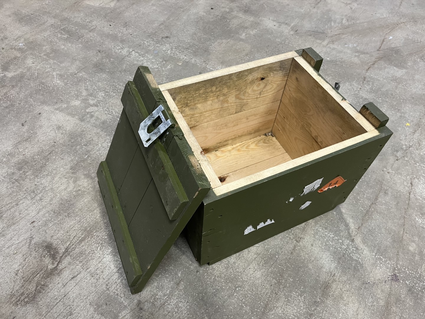 Der Deckel ist klappbar und mit einem stabilen Metallverschluss gesichert. Seitlich befindet sich ein Metallgriff zum einfachen Transport. Die Kiste verfügt über eine stabile Konstruktion mit zusätzlichen Holzverstärkungen und eignet sich ideal zur Aufbewahrung von Werkzeug, Outdoor-Ausrüstung oder Sammlerstücken.