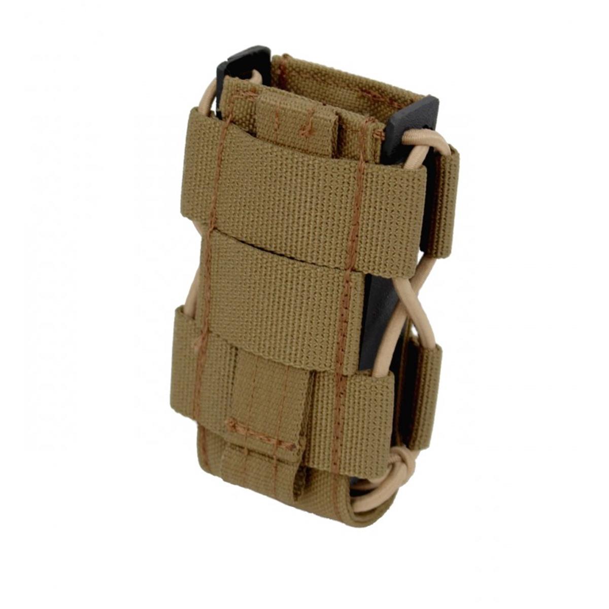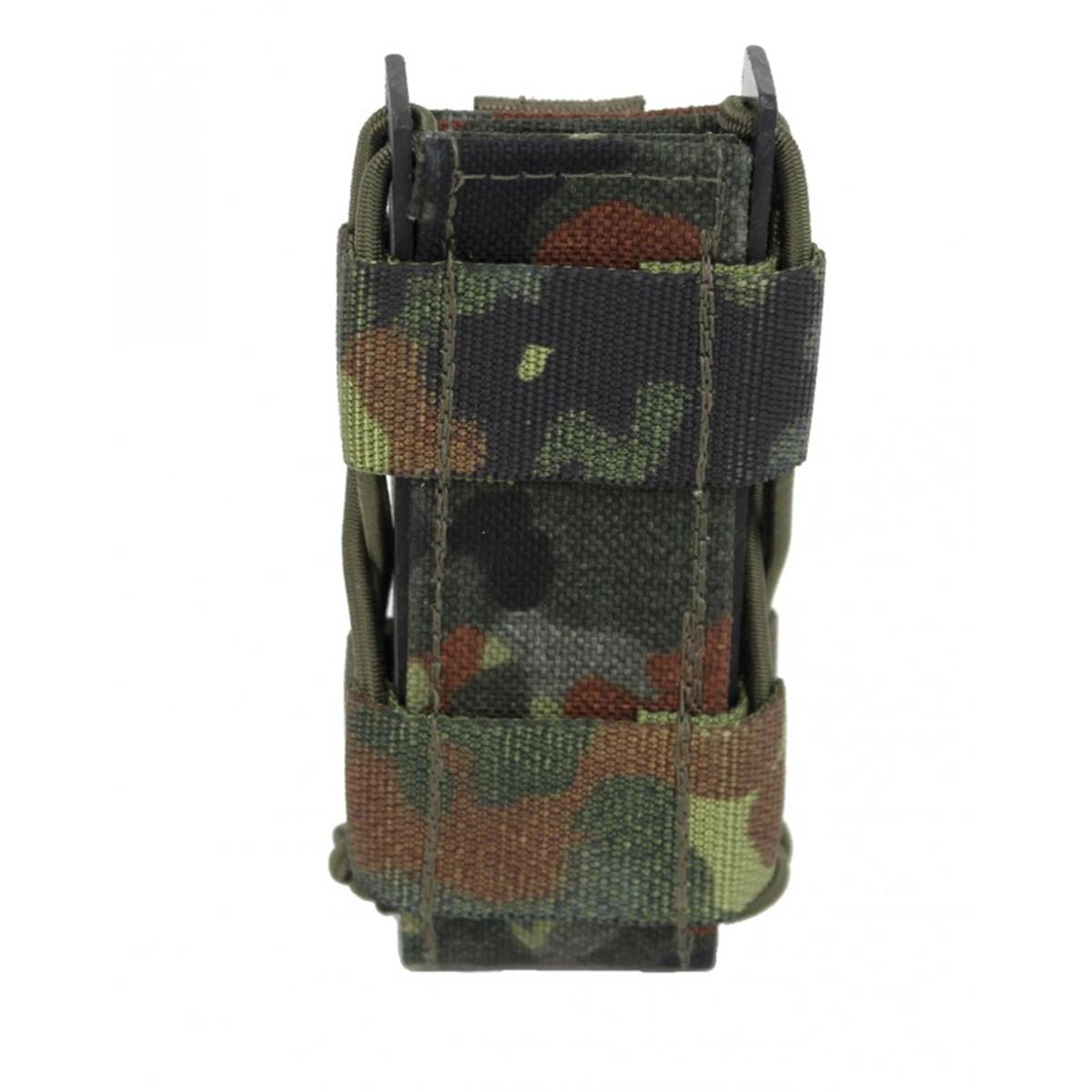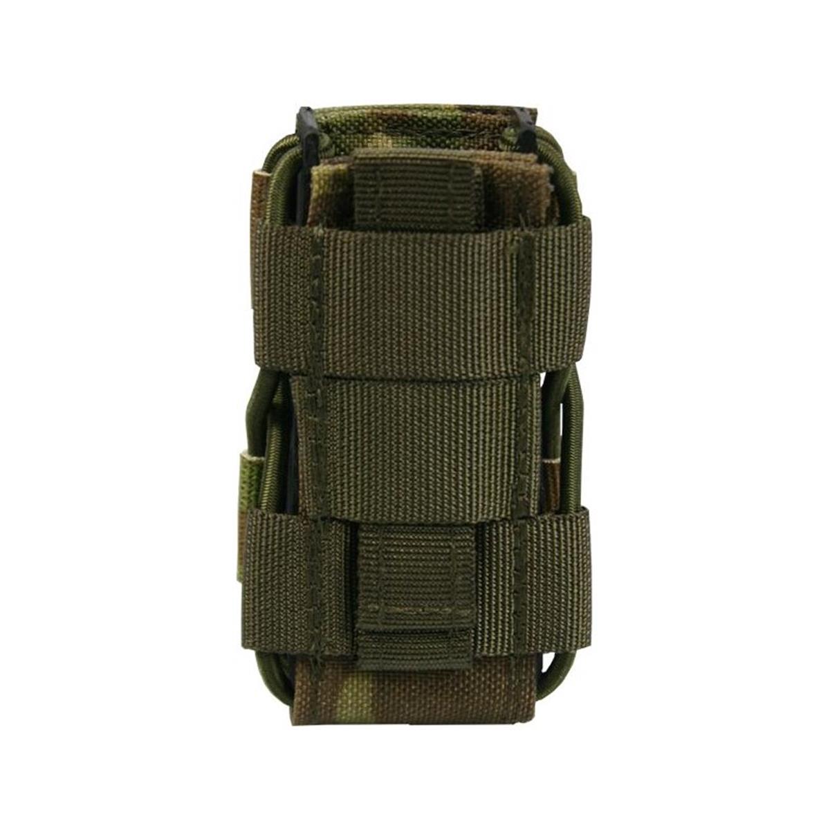 Die Hybridlösung für alle gängigen doppelreihigen Pistolenmagazine, sowie P8. Ein sicherer Halt des Magazins, sowie die schnelle Zieh- und Rückführungsgeschwindigkeit, werden durch ein mit Gummischnüren zusammengedrücktes Kydex® Profil erreicht. Dadurch wird dieses Produkt einzigartig auf dem deutschen Markt. Eine mit PAL´s besetzte Cordura® Front ermöglicht das Anbringen modularer Taschen. Dieses Multitalent ist daher die beste Allroundlösung für ihre Ausrüstung.