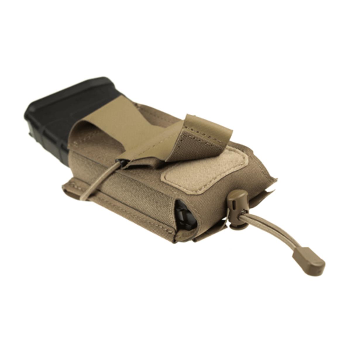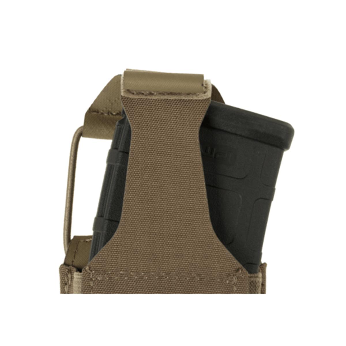 Die Claw Gear 5.56mm Backward Flap Mag Pouch hat einen neuartigen Verschluss, der durch ziehen vom Körper weg geöffnet wird und Zugriff auf das Magazin erlaubt. Der Zugwiderstand des Verschlusses kann durch ein Bungee-Cord individuell eingestellt werden. Bei Nichtgebrauch kann die Verschlusslasche an der Vorderseite der Magazintasche mit festgeklettet werden.