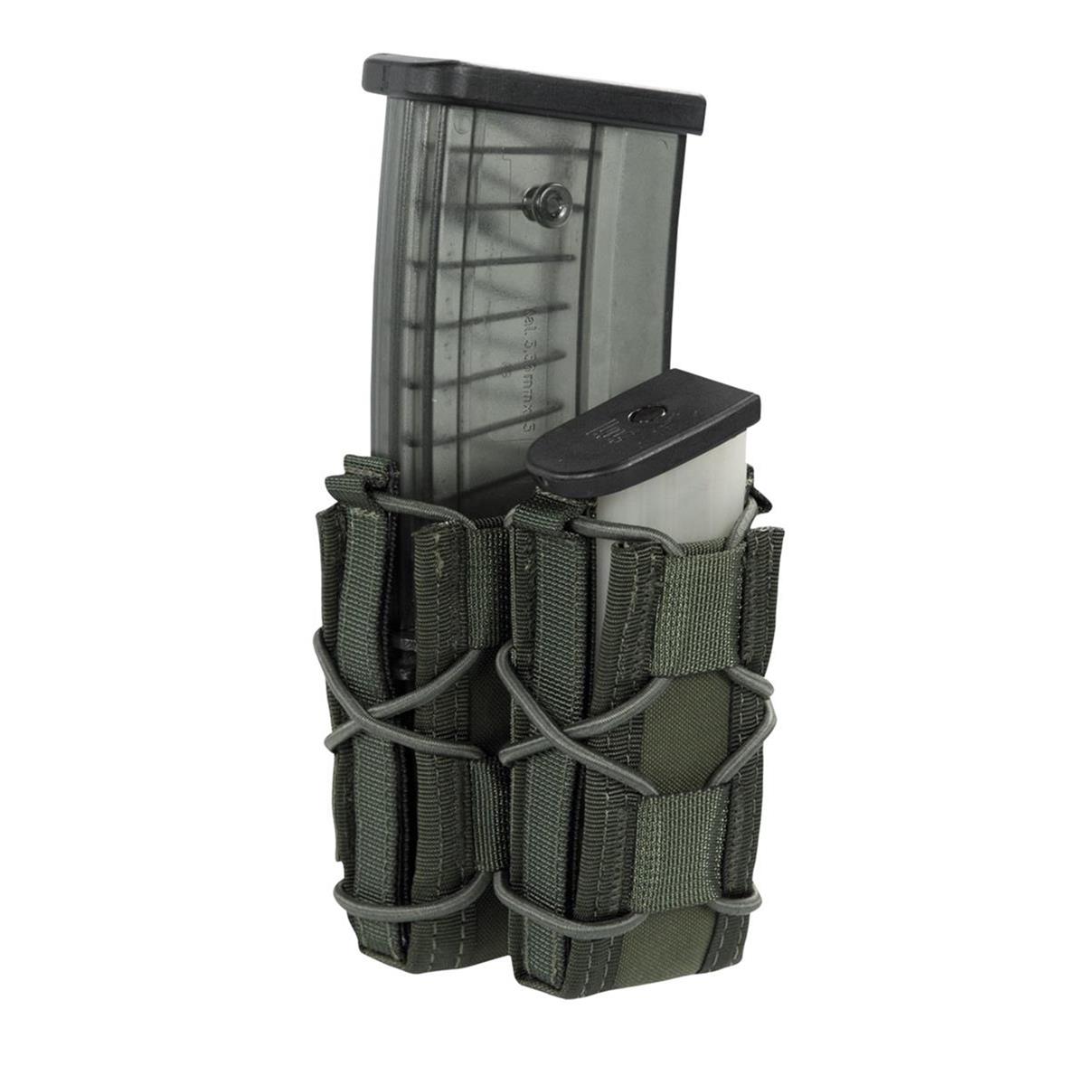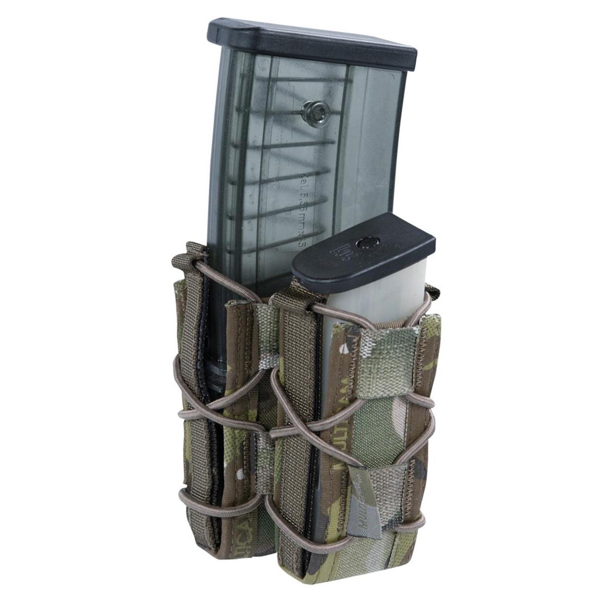 Die Warrior Assault Systems Multikaliber Magazintasche ist geeignet für je ein 9 mm und 5.56 mm Magazin und dient dem schnellen Magazinwechsel. Die Sicherung erfolgt durch ein eingenähtes Antirutsch-Material, durch die beiden seitlich nach oben gebogen L-Bügel und durch eine Gummikordel mit selbststehendem Puller (nur für die 5.56 Magazintasche). Die Größe lässt sich mühelos durch ein einstellbares seitliches Gummizugband mit L-Bügel und Kordelstopper einstellen. Mittels MOLLE-Schlaufen lässt sich die Magazintasche flexibel an der gewünschten Ausrüstung befestigen. Hergestellt aus wasserabweisendem, infrarot absorbierendem 1000DEN Cordura werden die Militärspezifikationen erfüllt.