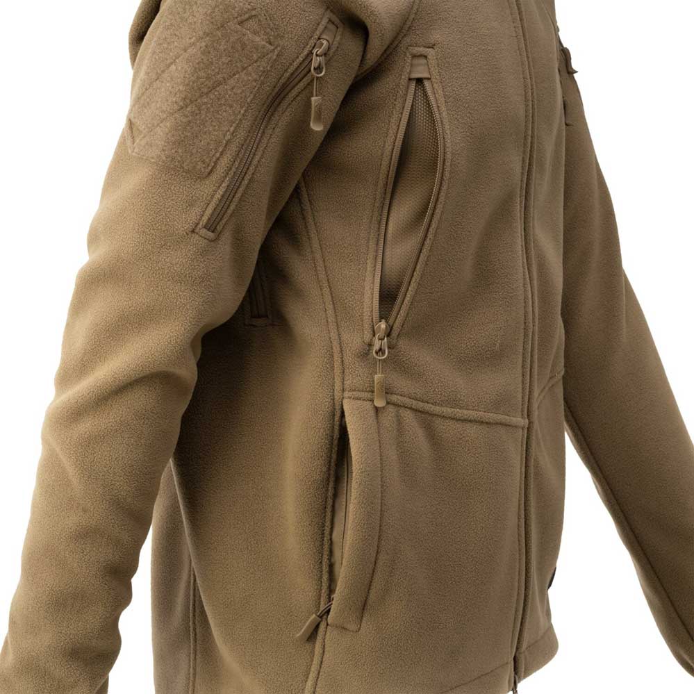 Das Hybrid-Fleece-Material besteht aus zwei verschiedenen Schichten. Äußerlich ähnelt es einem klassischen Fleece, innen ist es ein Gitterfleece, bekannt vom Alpha Hoodie und anderen Tactical Jackets dieses Herstellers. Es ist ein Material mit einer charakteristischen feinen Karostruktur aus dickeren, erhabenen quadratischen Stücken und dünneren Zwischenräumen. Dadurch ist die Patriot Mk2 leichter und atmungsaktiver aber hält Sie trotzdem genauso warm wie beim Vorgänger. Die Belüftungsöffnung mit dem Reißverschluss unter den Armen helfen bei der Wärmeregulierung.