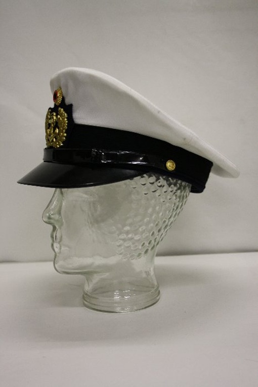 Schirmmütze aus Beständen der Bundeswehr Marine (EXBW). Sommerausführung mit weißem Mützenbezug, schwarzem Mützenband und schwarzem Lackschirm.