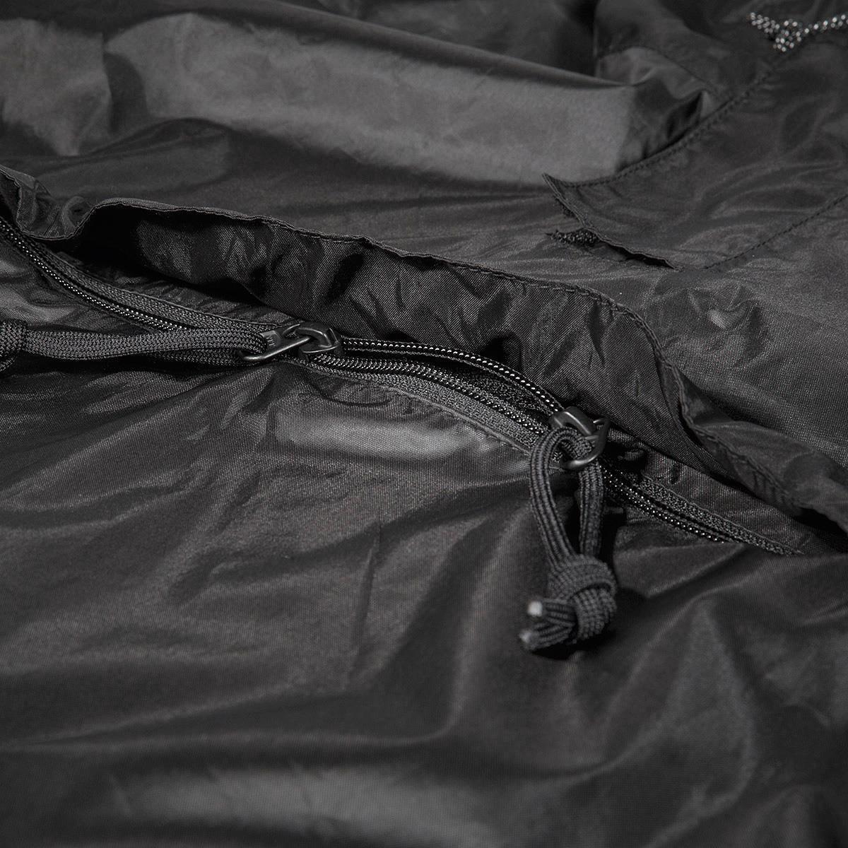 Wasserdichter Regenponcho mit Kapuze sowie per Reißverschluss verschließbare Seiten und einer großen Reißverschluss-Frontöffnung.