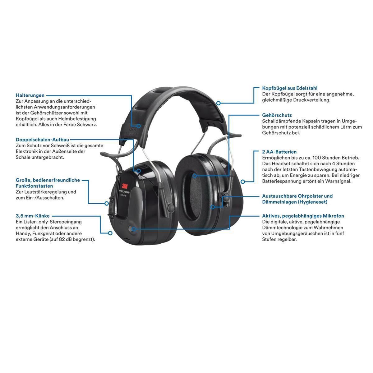 - Anschließen von Zweiwege-Funkgerät oder Handy über 3,5 mm Buchse möglich (auf 82 dB begrenzt)
