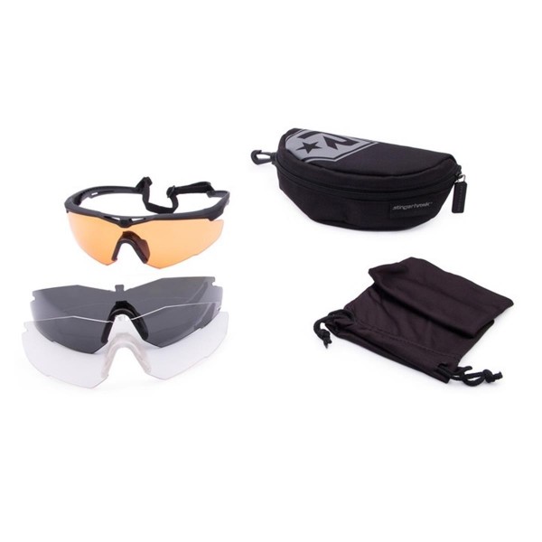 Lieferumfang: 1 x Revision STINGERHAWK Rahmen in schwarz, 1 Mikrofaserbeutel, 1 Nackenband, 1 Case mit Gürtelclip, 1 klare Linse, 1 graue Linse und 1 orange Linse