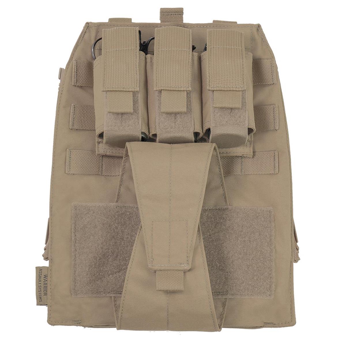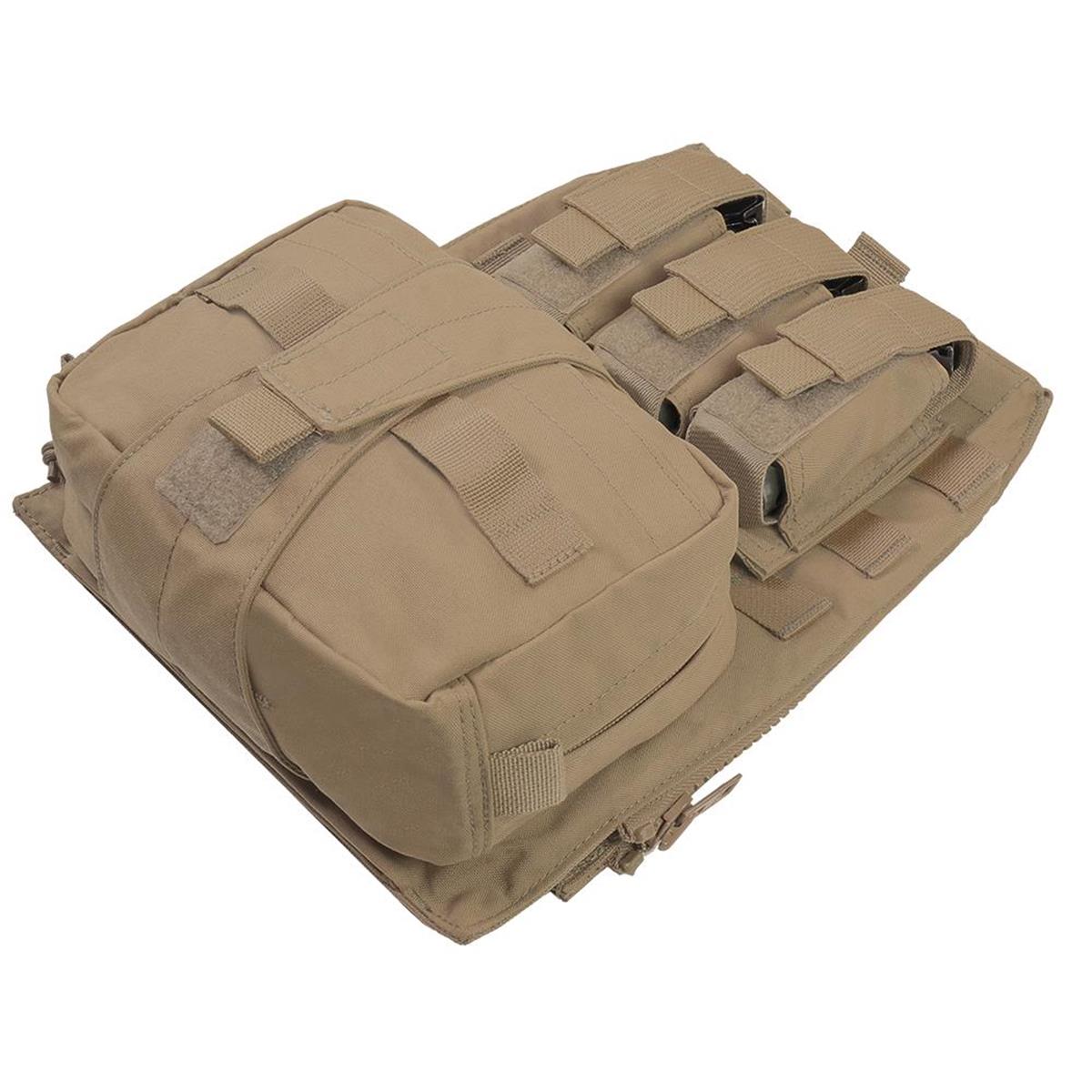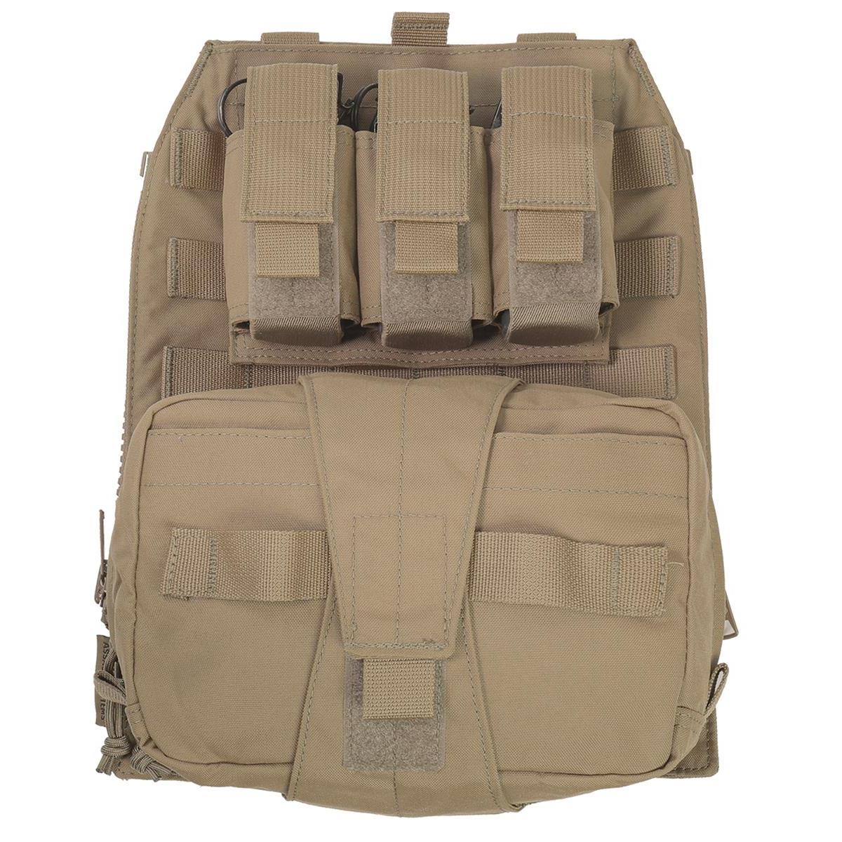 Der Assaulters Back Panel (ABP) von Warrior Assault Systems ist kompatibel mit den Warrior Plattenträgern LPC, RPC und DCS. Mit dem MOLLE-Reißverschlussadapter-Kit kann das Assaulters Back Panel schnell und einfach auf der Rückseite des Trägers befestigt werden. Das Adapter-Kit besteht aus einer linken und einer rechten vertikalen Reißverschlussblende mit MOLLE-Befestigungsschlaufen, mit welchen die Reißverschlussblenden an der Rückseite des Trägers befestigt werden. So kann das Panel bei Bedarf mit den Reißverschlüssen an- und abgezippt werden. Das Panel besitzt eine modulare 3er 40 mm Kampfmitteltasche für Blendgranaten und eine abreißbare Mehrzweck/ Medic Tasche mit Klettrücken. Das Assaulters Back Panel besitzt zudem ein Trinkblasenfach mit Klettverschluss. In dem Fach befindet sich eine nach unten herausziehbare Tasche um Aufbruchwerkzeug, wie Spreizhämmer, Halligan und Bolzenschneider zu transportieren.