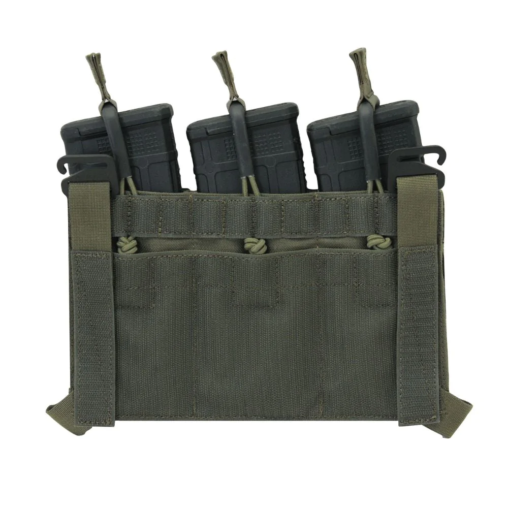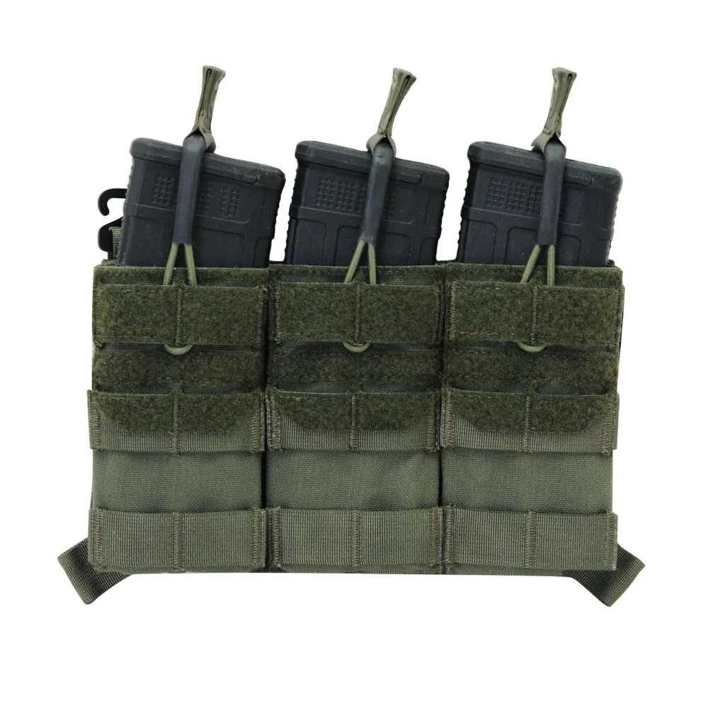 Es fasst drei 5.56er Magazine und lässt sich an jedem plakattauglichen Plattenträger entweder mit G-Haken oder Plakatschnallen befestigen (Schnallen und G-Haken im Lieferumfang enthalten).