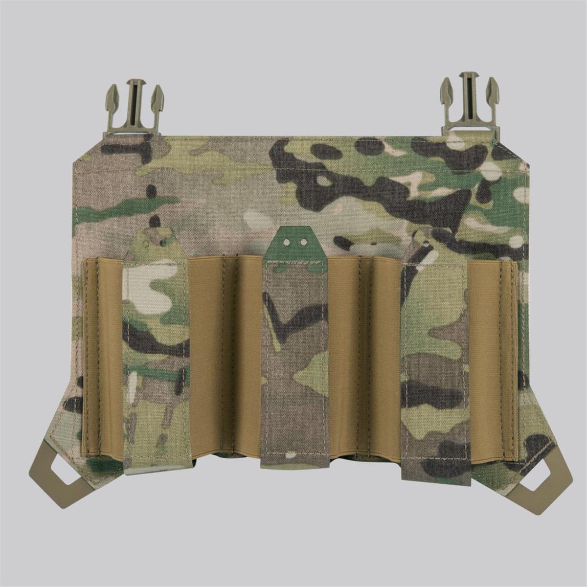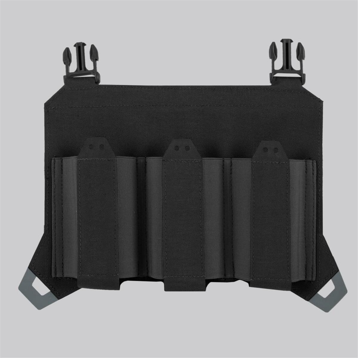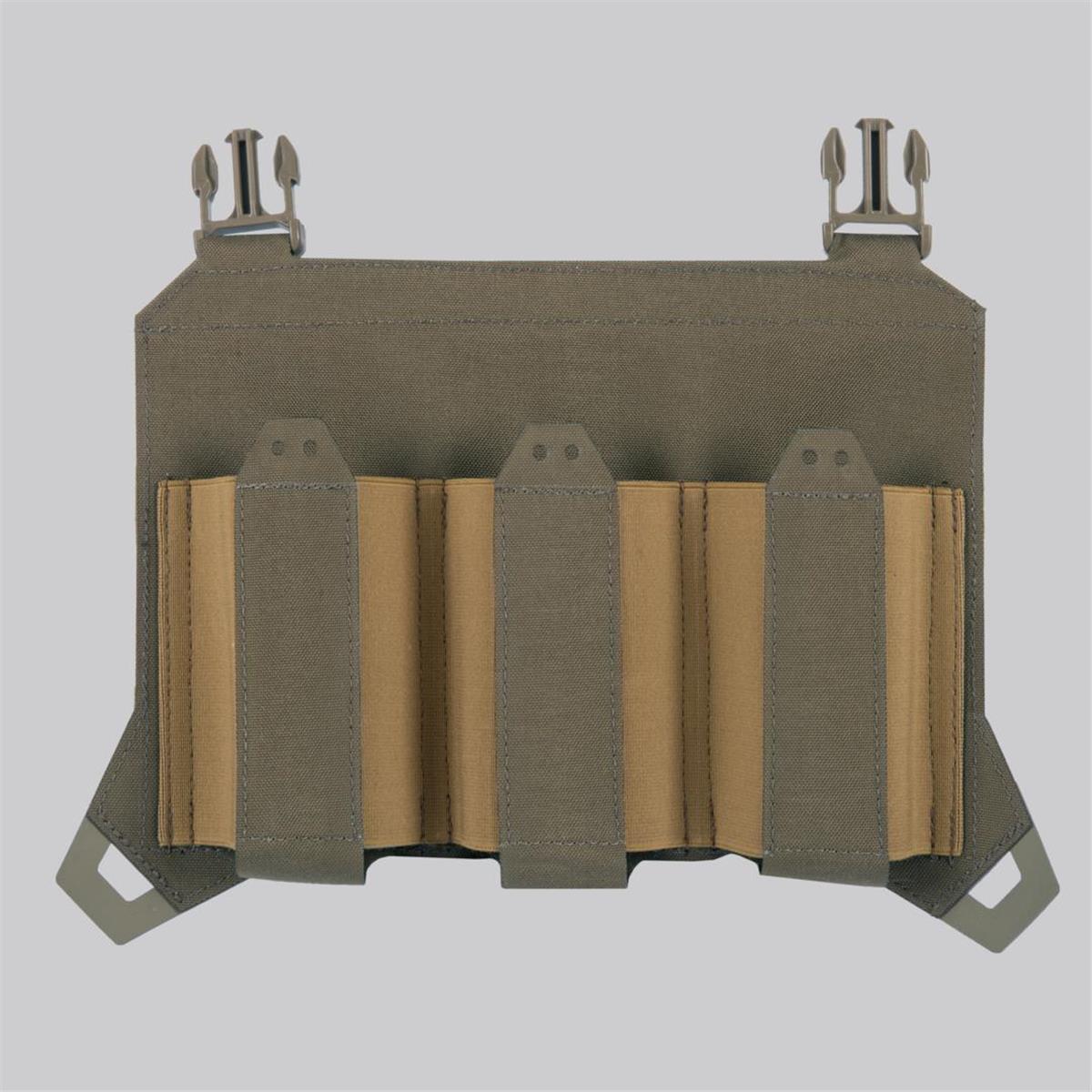 Diese Flap ermöglicht es, drei Magazine zusätzlich am Plattenträger anzubringen und dabei dennoch ein flaches Design zu erhalten. Hergestellt aus elastischem Webbing und unterteilt in drei Fächer kann die Flap drei Magazine des Typs AR/AK aufnehmen. Zusätzlich können zur Sicherung noch Bungee Cord Puller angebracht werden. Die Flap wird mittels Molle-Schlaufen oder durch die vorhandenen Schnallen am Plattenträger befestigt.