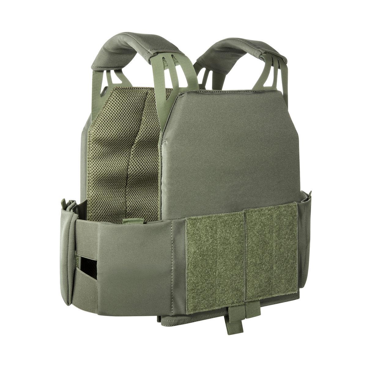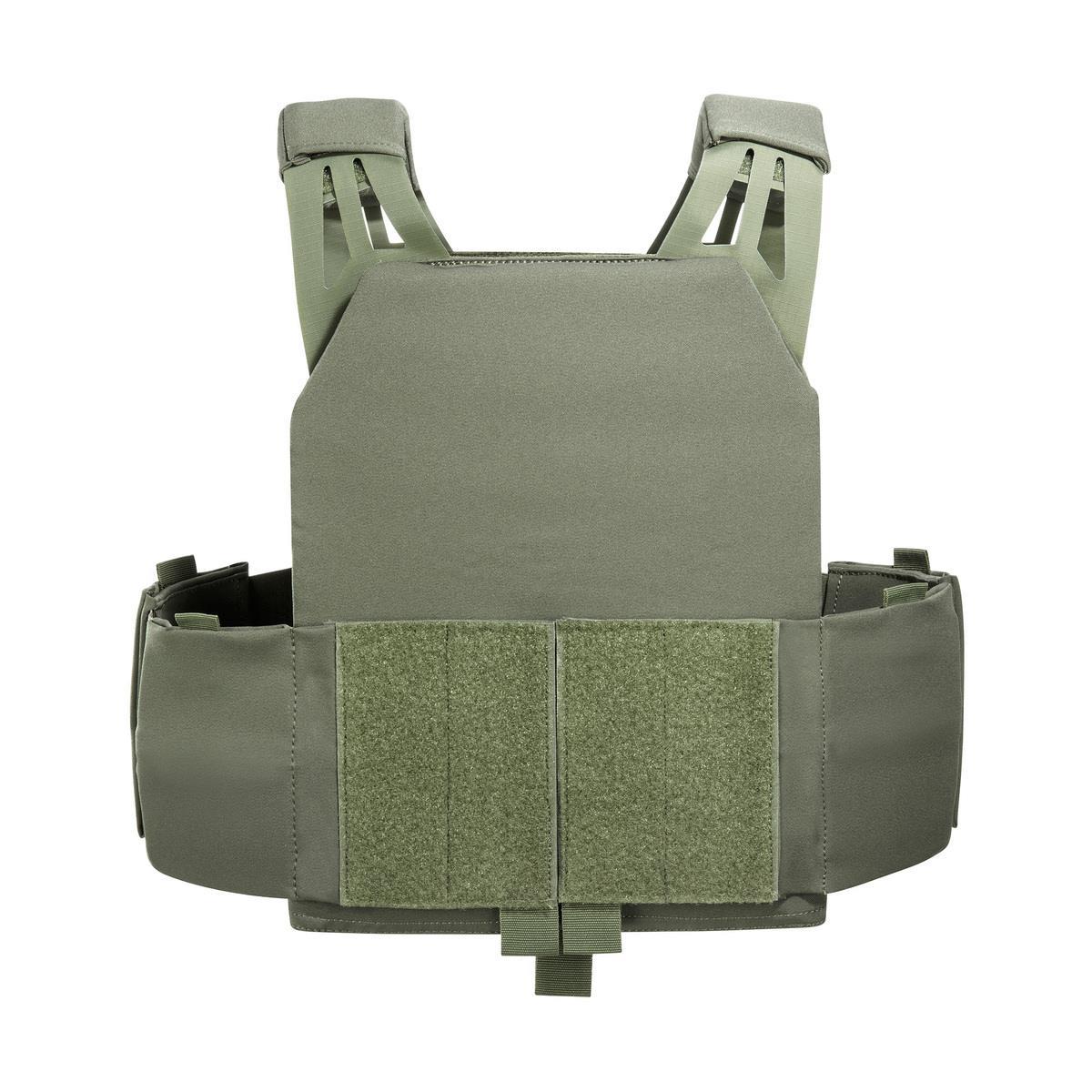 Leichter, flacher Plattenträger mit neutraler Front. Der Träger ist als Unterziehträger ausgelegt. Er besitzt eine längenverstellbare, elastische Seitenbefestigung sowie zwei fixe und zwei abnehmbare elastische Seitentaschen für Magazine, Funkgeräte oder Kleinteile. Die Frontseite bietet keine Befestigungsmöglichkeiten. Die Größe S/M ist für gängige SAPI-Platten bis 30 x 25 cm ausgelegt, die Größe L bis 33 x 26 cm.