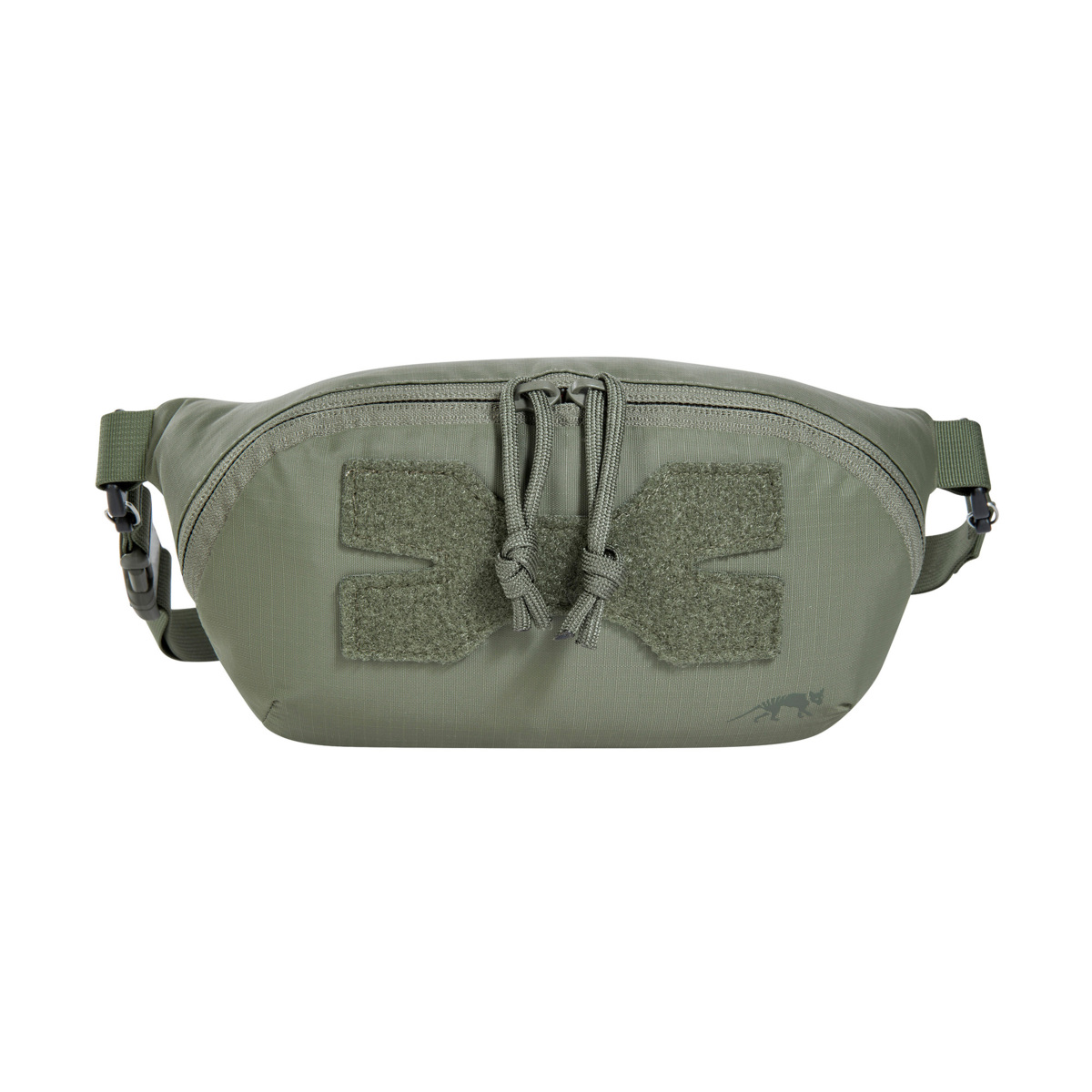 Der Gurtband-Hüftgurt ist mit Haken befestigt, mit diesen kann die Tasche auch in MOLLE-Systeme eingehängt werden.