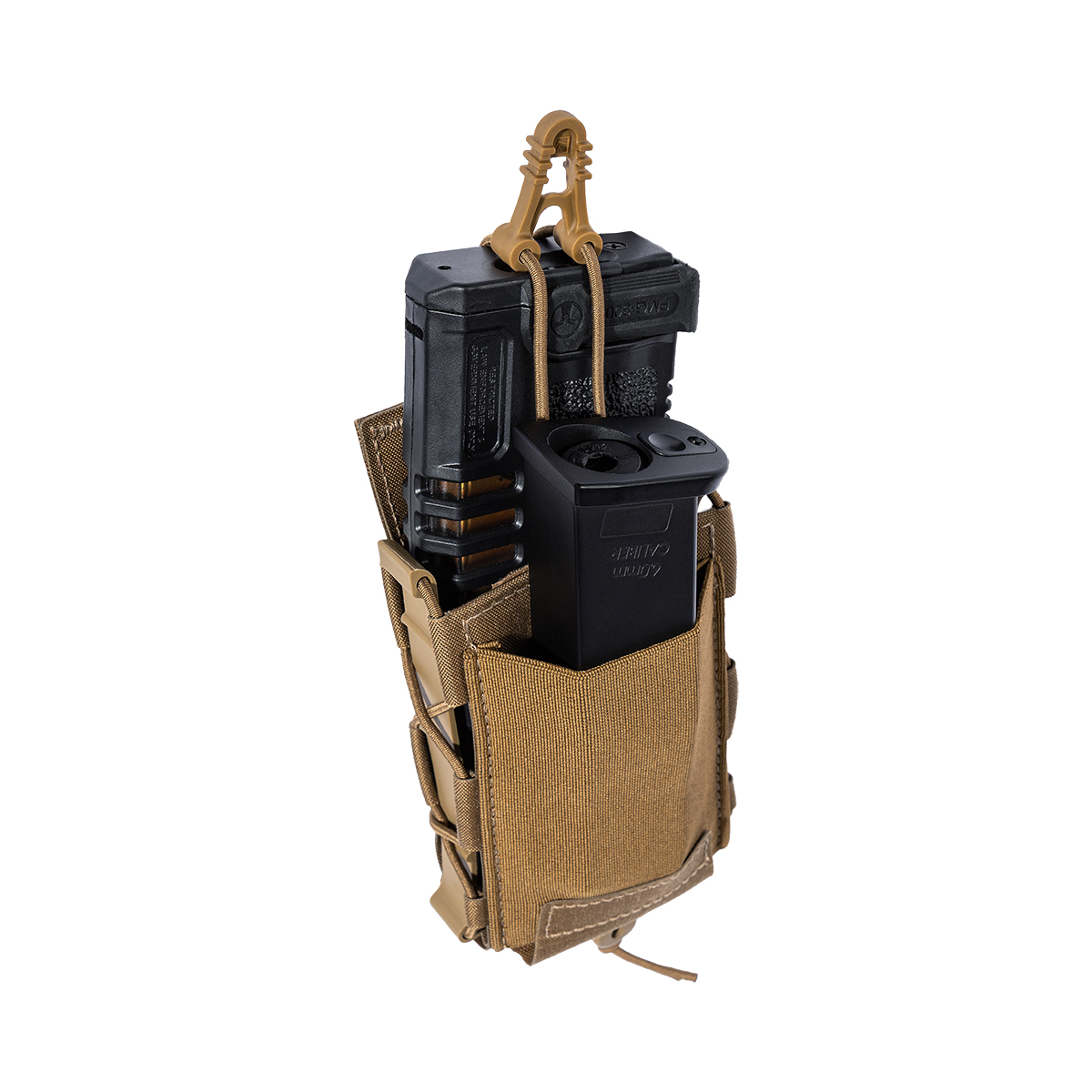 Die Multikalibertasche Hybrid MX114 ist eine vielseitige Magazintasche für unterschiedlichste Gewehrkaliber. Dank der innovativen L-Bügel-Konstruktion lassen sich Magazine von AR15 bis HK417 (Kaliber 5,56 × 45 mm bis ca. 7,62 × 51 mm) sicher aufnehmen. Zusätzlich bietet das aufgesetzte Stretch-Fach Platz für Pistolenmagazine oder kleine Ausrüstungsgegenstände.