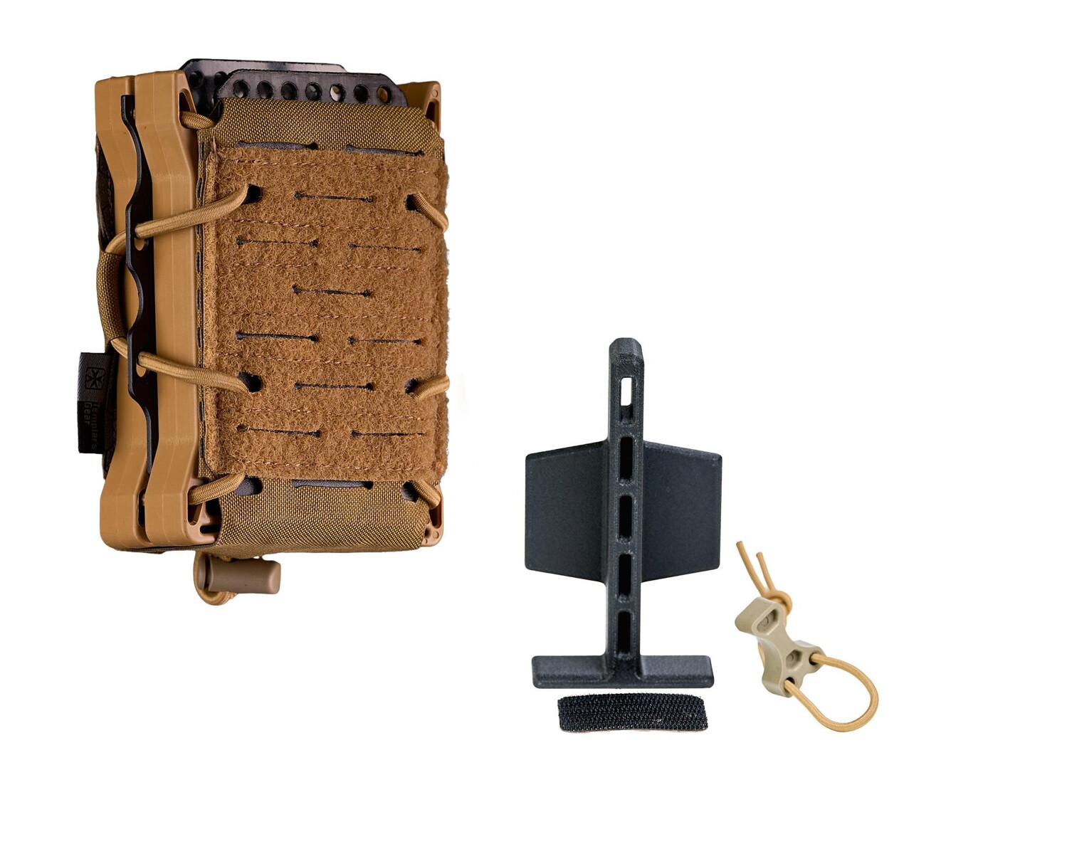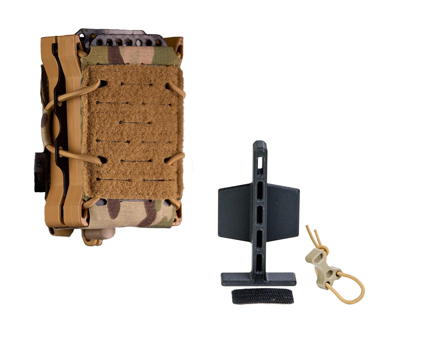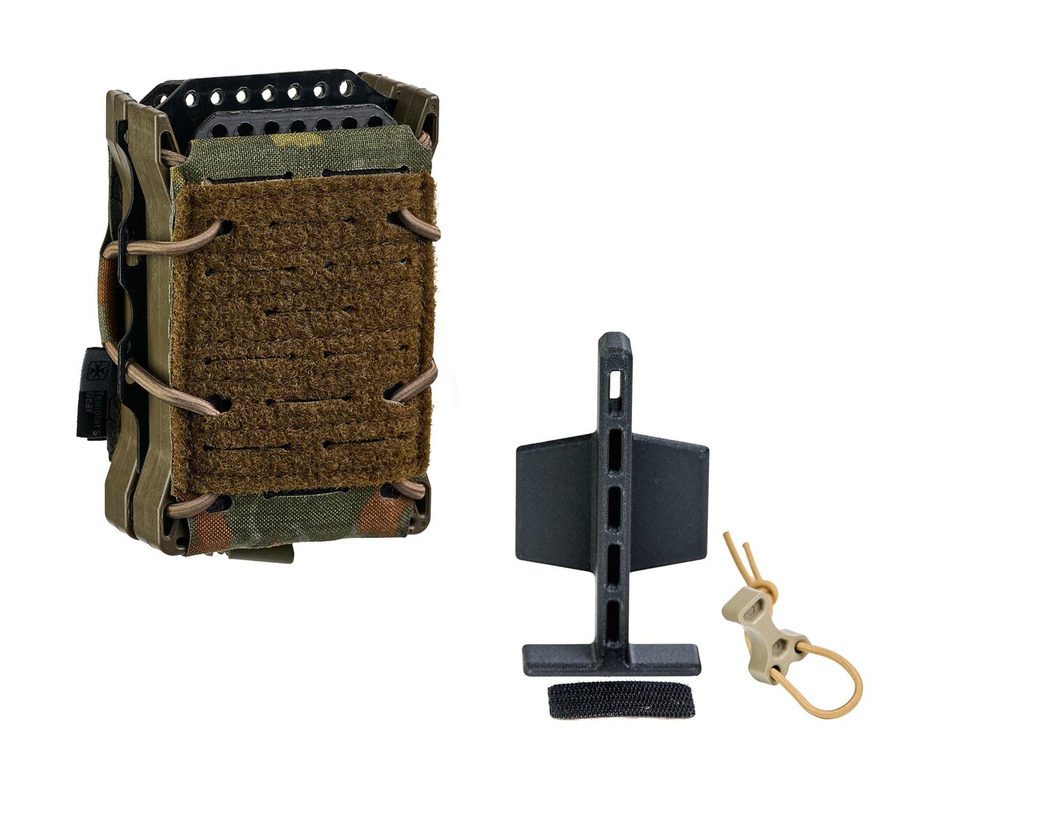 Die Konstruktion verfügt über ein selbstanpassendes Haltesystem sowie einen herausnehmbaren und verstellbaren Divider. Laser-Cut MOLLE und eine Klettfläche auf der Vorderseite ermöglichen die Erweiterung mit zusätzlicher Ausrüstung. Die Befestigung erfolgt über ein MOLLE-System aus Cordura®.