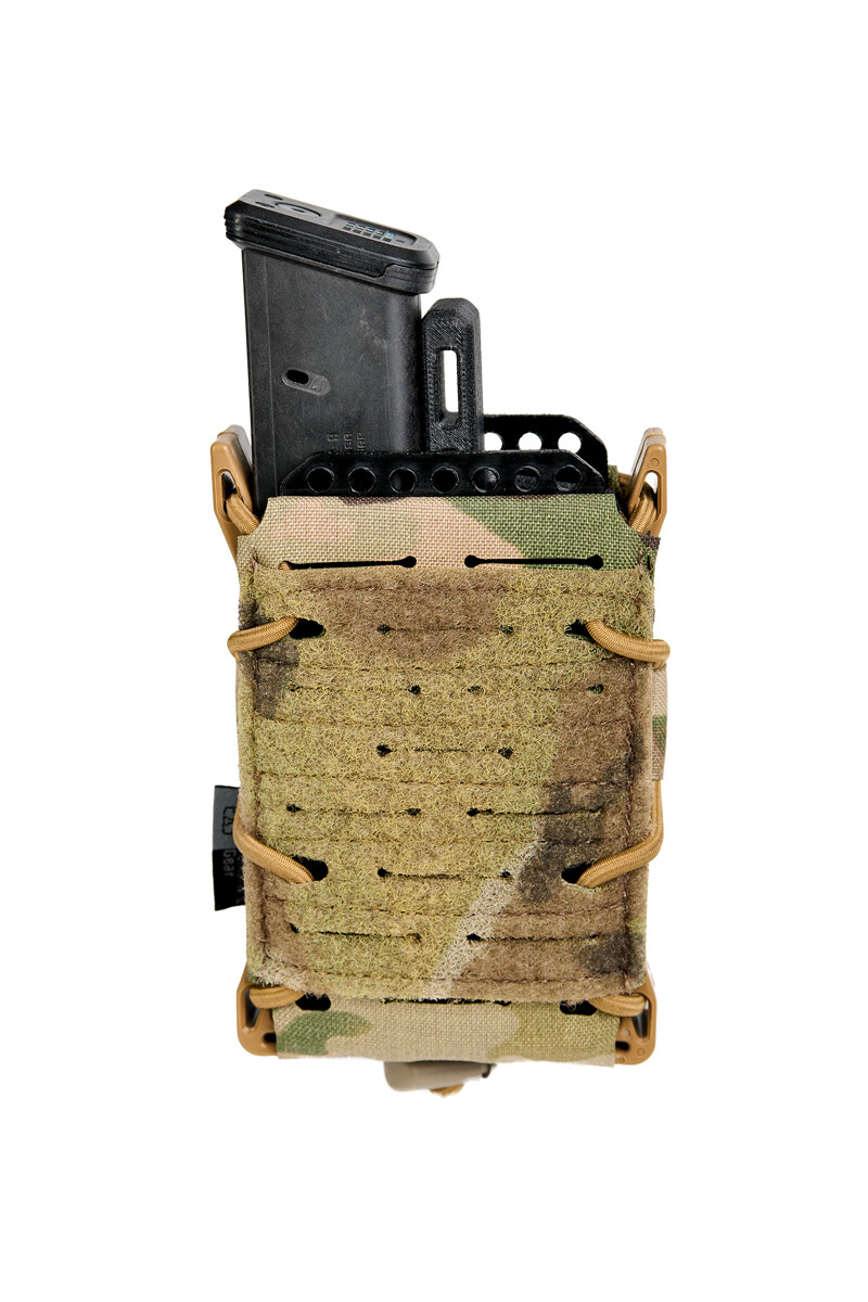 Die Konstruktion verfügt über ein selbstanpassendes Haltesystem sowie einen herausnehmbaren und verstellbaren Divider. Laser-Cut MOLLE und eine Klettfläche auf der Vorderseite ermöglichen die Erweiterung mit zusätzlicher Ausrüstung. Die Befestigung erfolgt über ein MOLLE-System aus Cordura®.