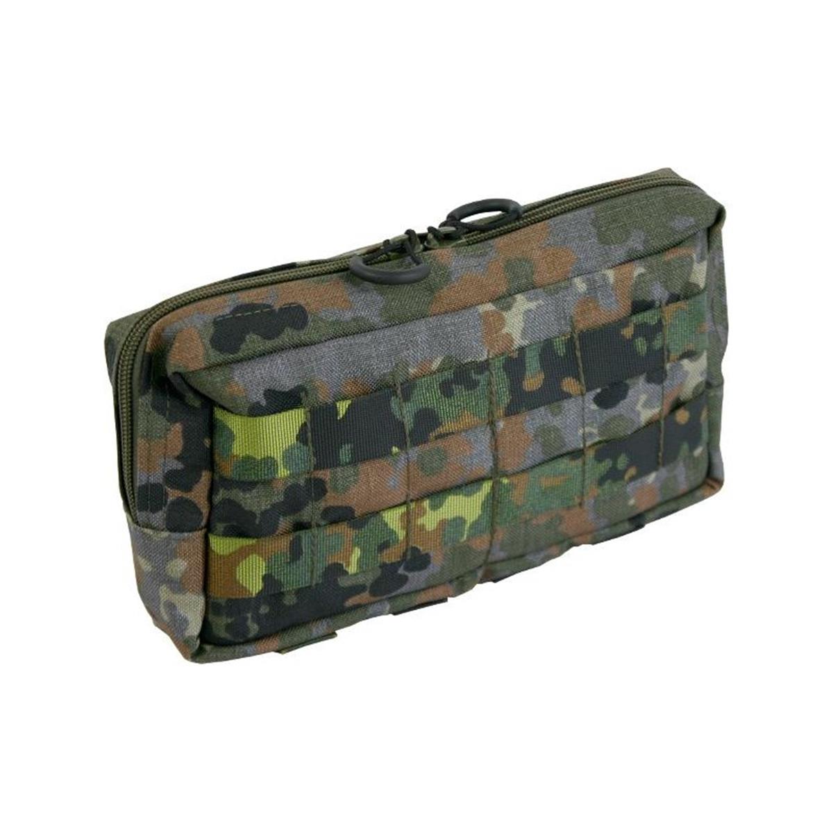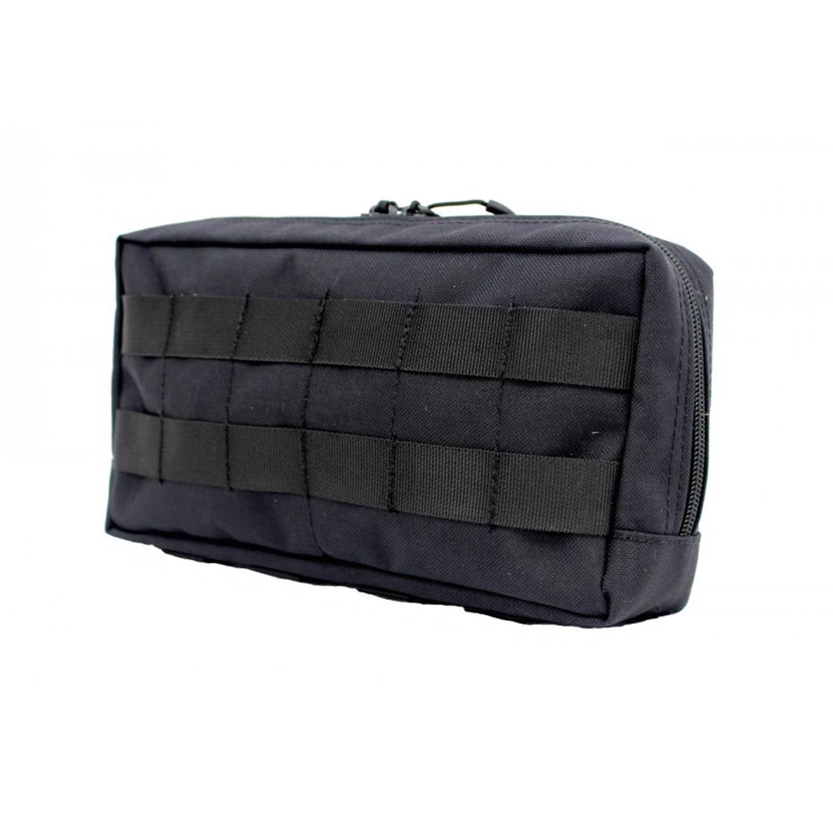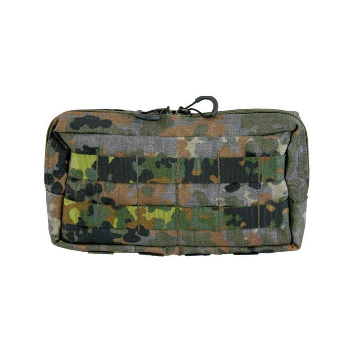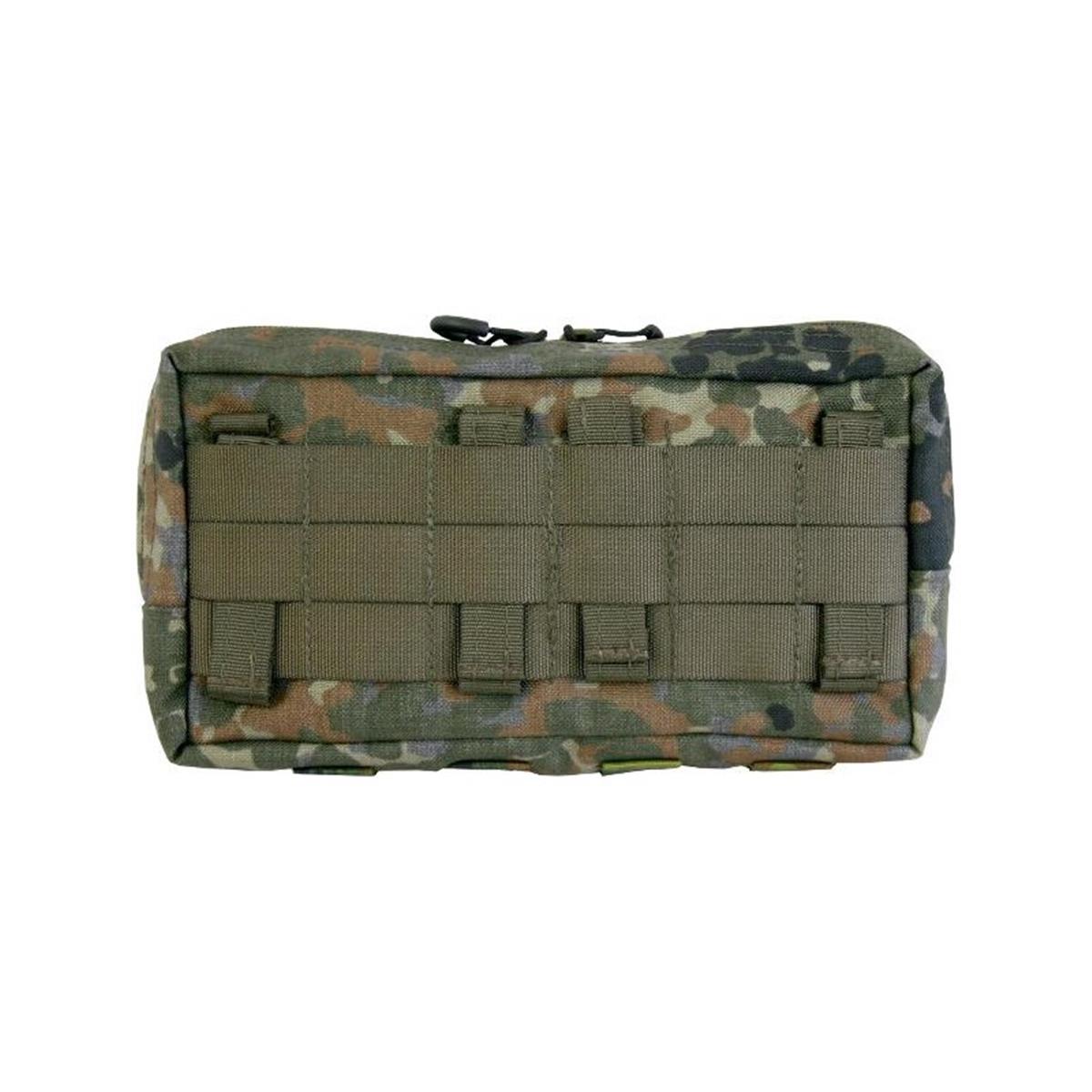 Die Mehrzwecktasche horizontal ist zur Verwendung an Kummerbunden, an Plattenträgern oder auf den Platten selbst konzipiert. Durch ihre flache Bauweise lässt sie sich auch hervorragend hinten am Gefechtsgurt tragen, beispielsweise als persönliche medizinische Ausstattung, für Ersatzmaterial oder Nachschub. Auf der nach aussen gewandten Innenseite sind 2 Netztaschen verbaut, in der sich Kleinkram organisieren lässt. An den angenähten Gummischlaufen auf der zum Körper gewandten Seite lassen sich größere Gegenstände fixieren.