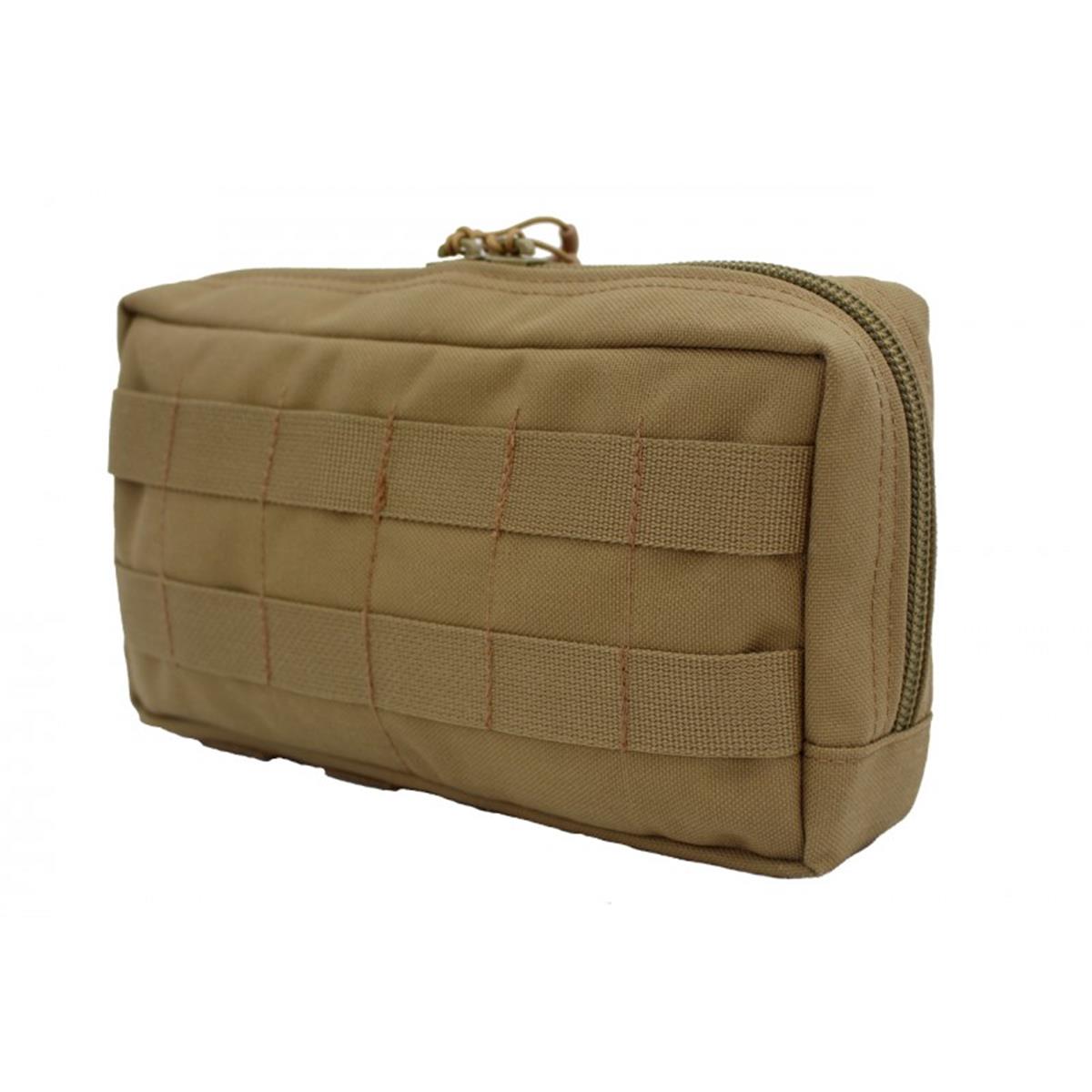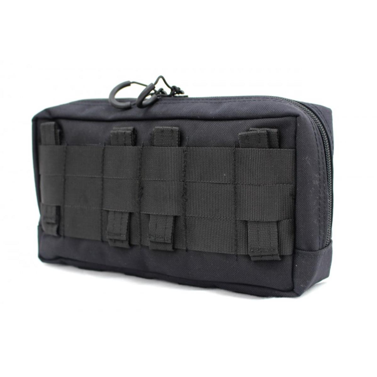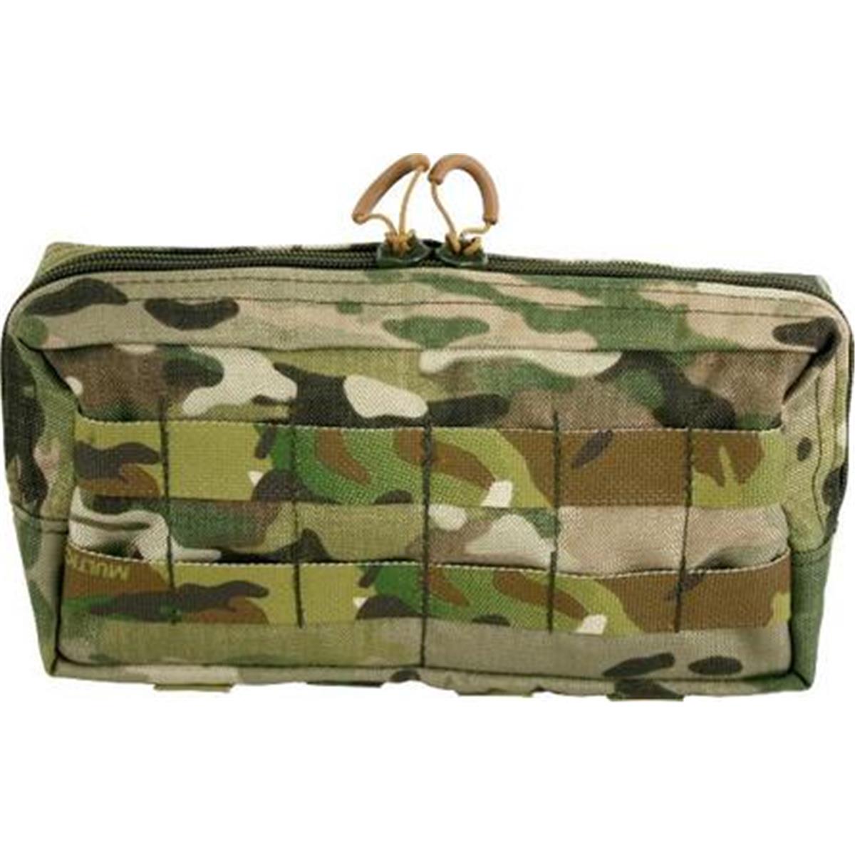 Die Mehrzwecktasche horizontal ist zur Verwendung an Kummerbunden, an Plattenträgern oder auf den Platten selbst konzipiert. Durch ihre flache Bauweise lässt sie sich auch hervorragend hinten am Gefechtsgurt tragen, beispielsweise als persönliche medizinische Ausstattung, für Ersatzmaterial oder Nachschub. Auf der nach aussen gewandten Innenseite sind 2 Netztaschen verbaut, in der sich Kleinkram organisieren lässt. An den angenähten Gummischlaufen auf der zum Körper gewandten Seite lassen sich größere Gegenstände fixieren.