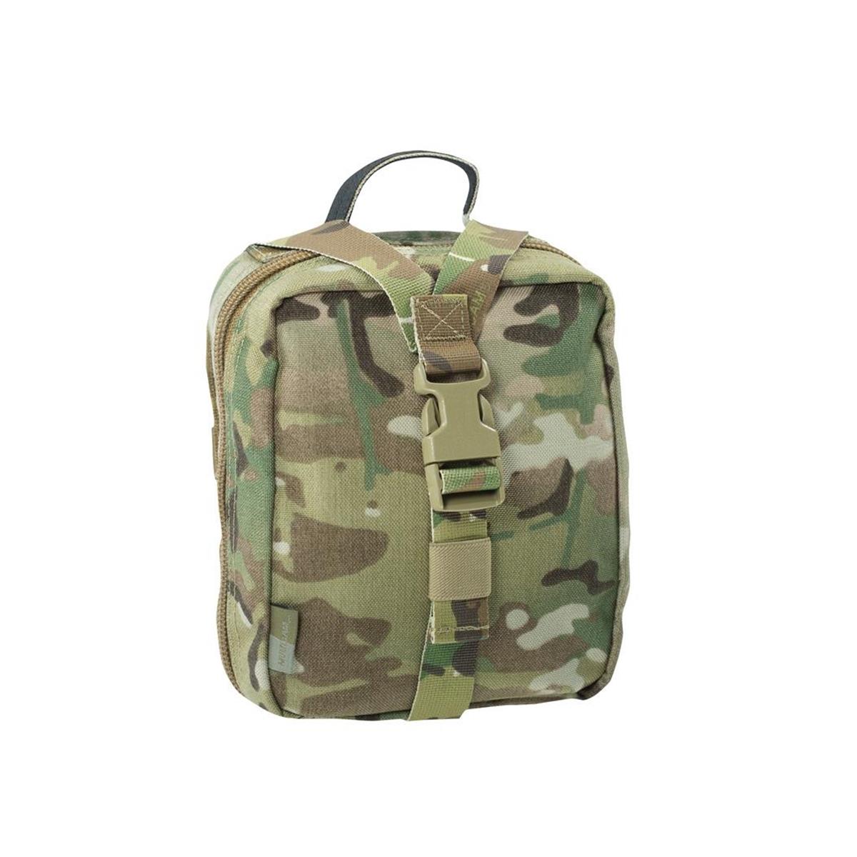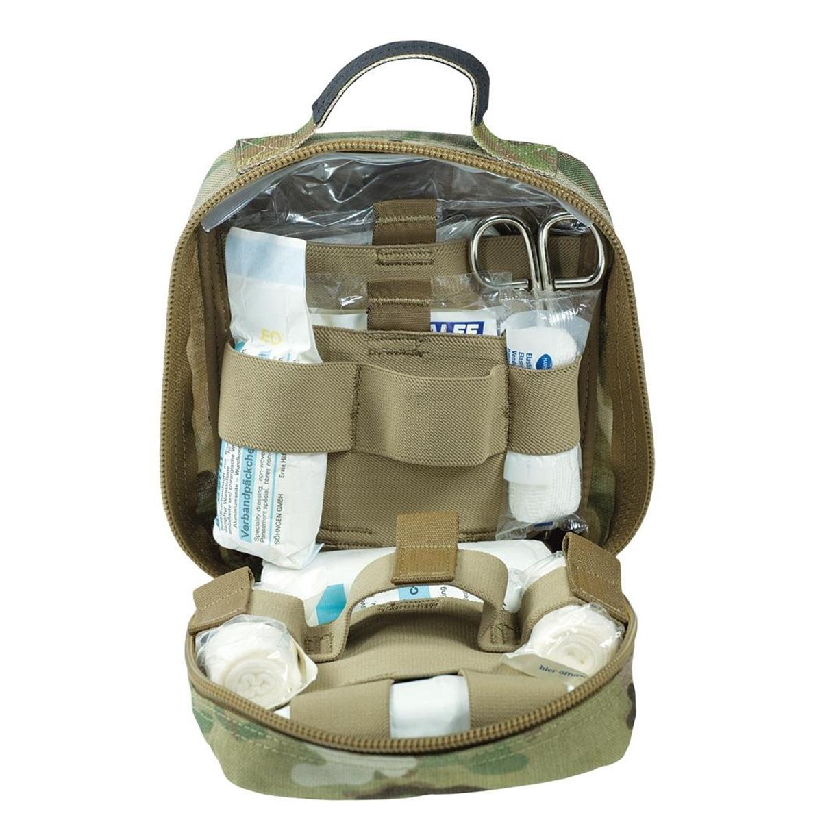 Die Warrior Assault Systems Medic Rip Off Pouch dient zur Aufnahme der Erstversorgungsmaterialien. Die Tasche kann durch Klett- und Flauschband von einer Plattform getrennt werden und so flexibel genutzt werden. Die Plattform verbleibt auf der Weste/dem Chest Rig, woran sie mit MOLLE-Schlaufen befestigt wird. Sie verfügt über einen weit zu öffnenden 2-Wege-RV und innenliegende elastische Gummibandschlaufen zum Fixieren der Erste-Hilfe-Materialien. Hergestellt aus wasserabweisendem, infrarot absorbierendem 1000DEN Cordura werden die Militärspezifikationen erfüllt.